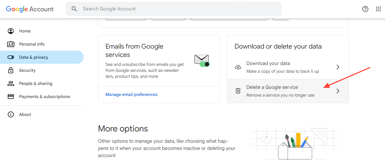 - Scroll down to "Data from apps and services you use" and click on "Delete a Google service”.