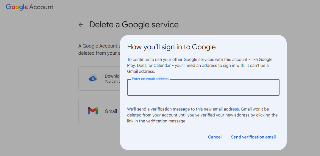 - Enter an existing email address you want to sign in to Google services with and click “Send verification email.” You cannot use another Gmail address.
