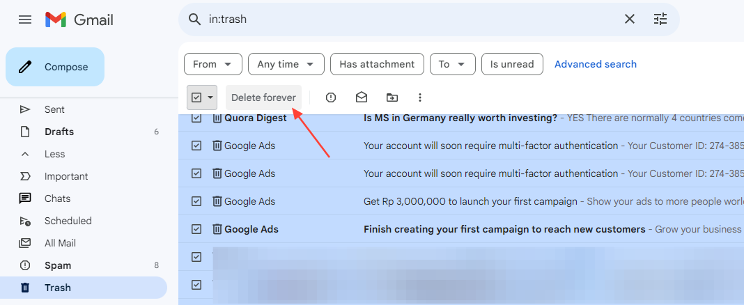 - Once you've moved all the unwanted emails to the trash, go to the trash folder and click on the "Delete Forever" button to permanently delete them.