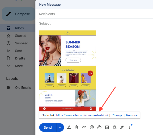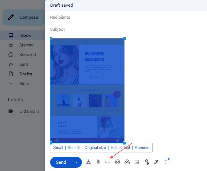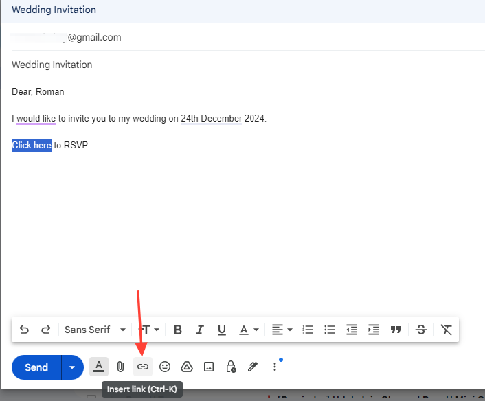 - Click on the "Insert link" button in the formatting bar at the bottom of the compose window. Alternatively, use the keyboard shortcut