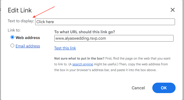 - If needed, you can edit the display text in the "Text to display" field.