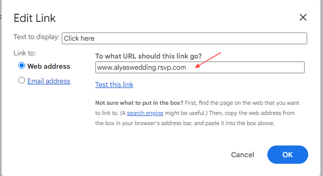 - In the pop-up window, paste the URL you want to include. You can also test the link by clicking "Test this link."