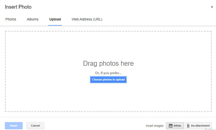 - In the "Add an image" popup, upload the image you want to hyperlink. You can use Gmail's automatic resizing options to adjust the image size.